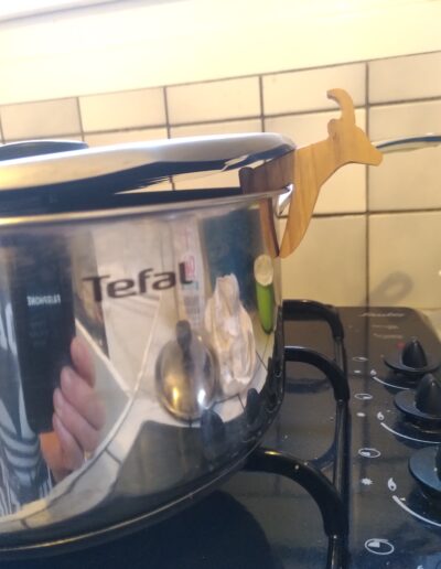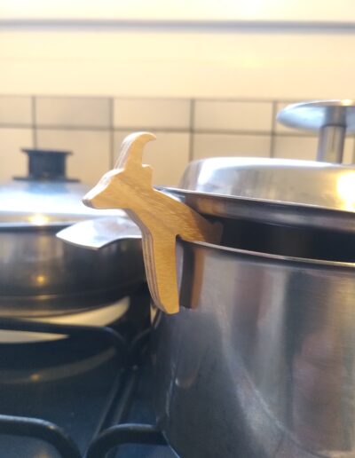 Figurines de bouquetin en robinier, à intercaler entre le couvercle et la casserole pour éviter des débordements causés par l’ébulition lors de la cuisson. Il est possible de la placer tête tournée vers l’intérieur, suivant la forme du couvercle la corne peut servir à caler celui-ci.