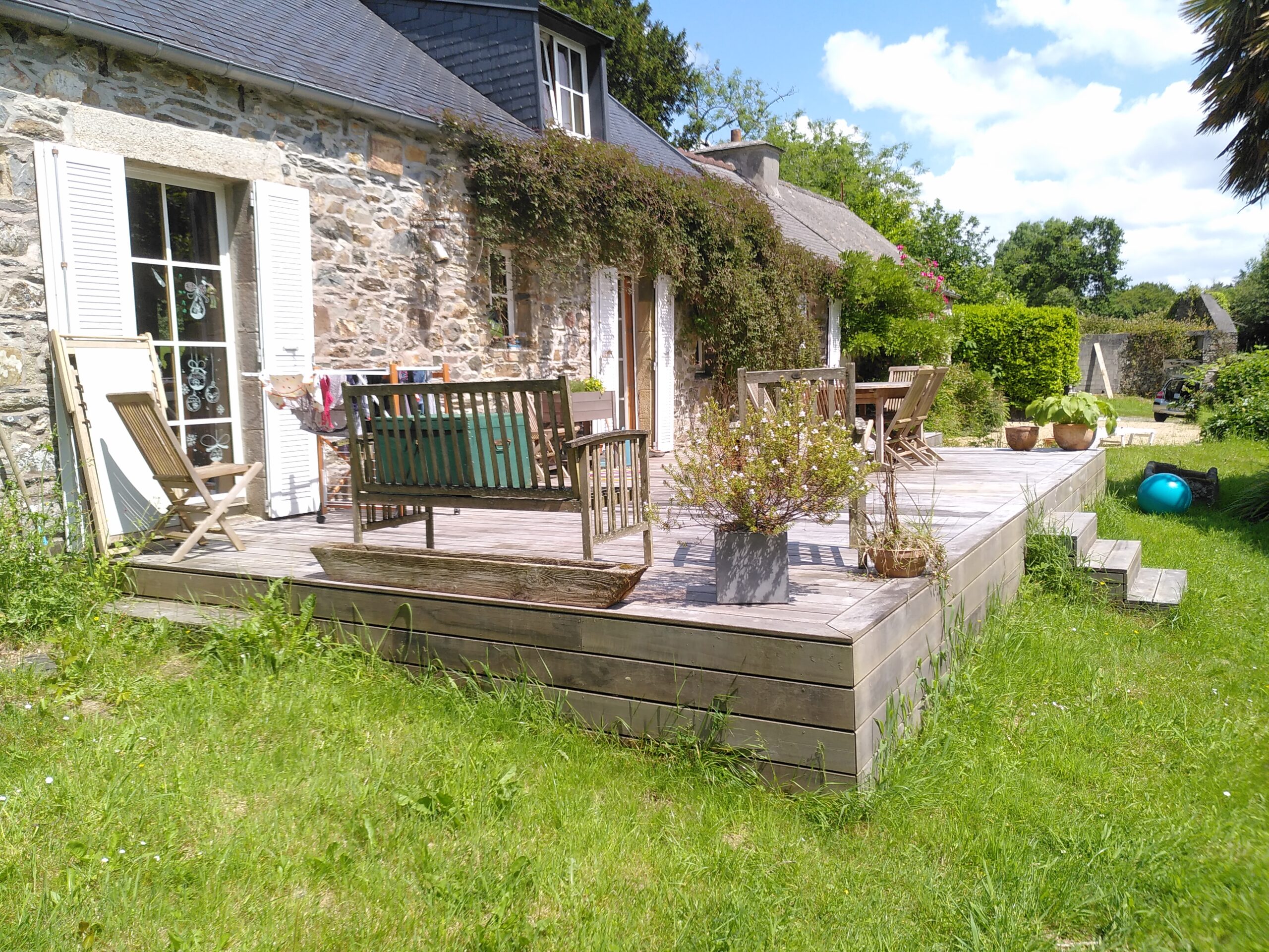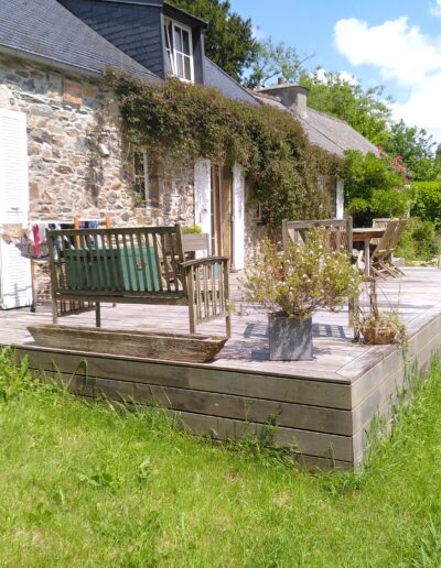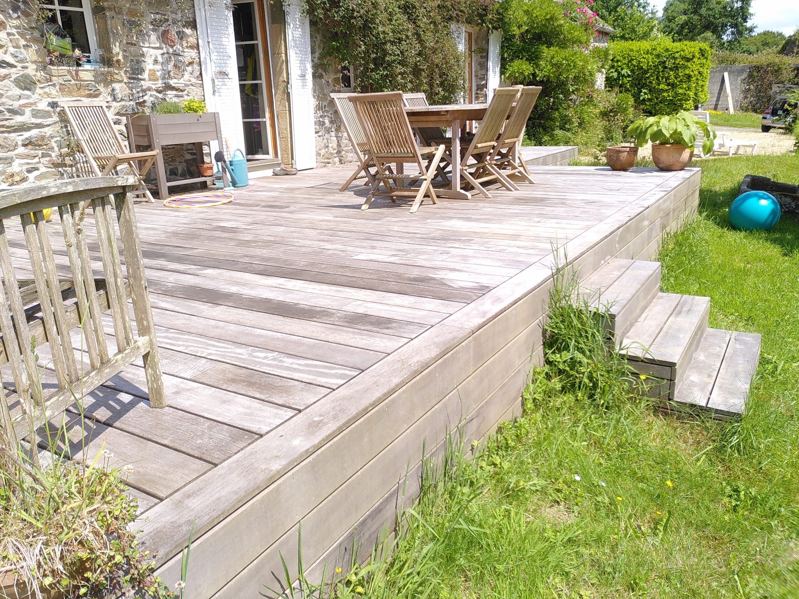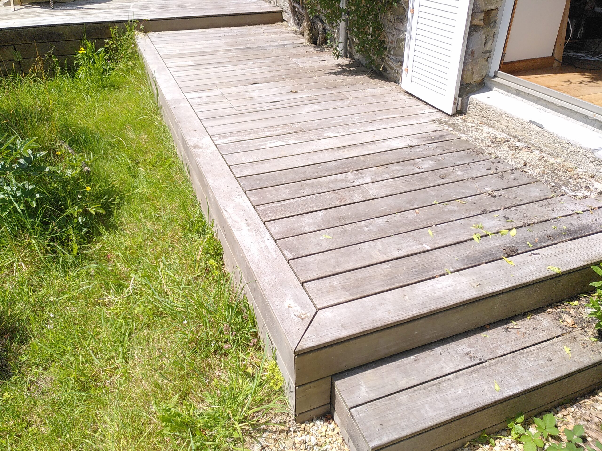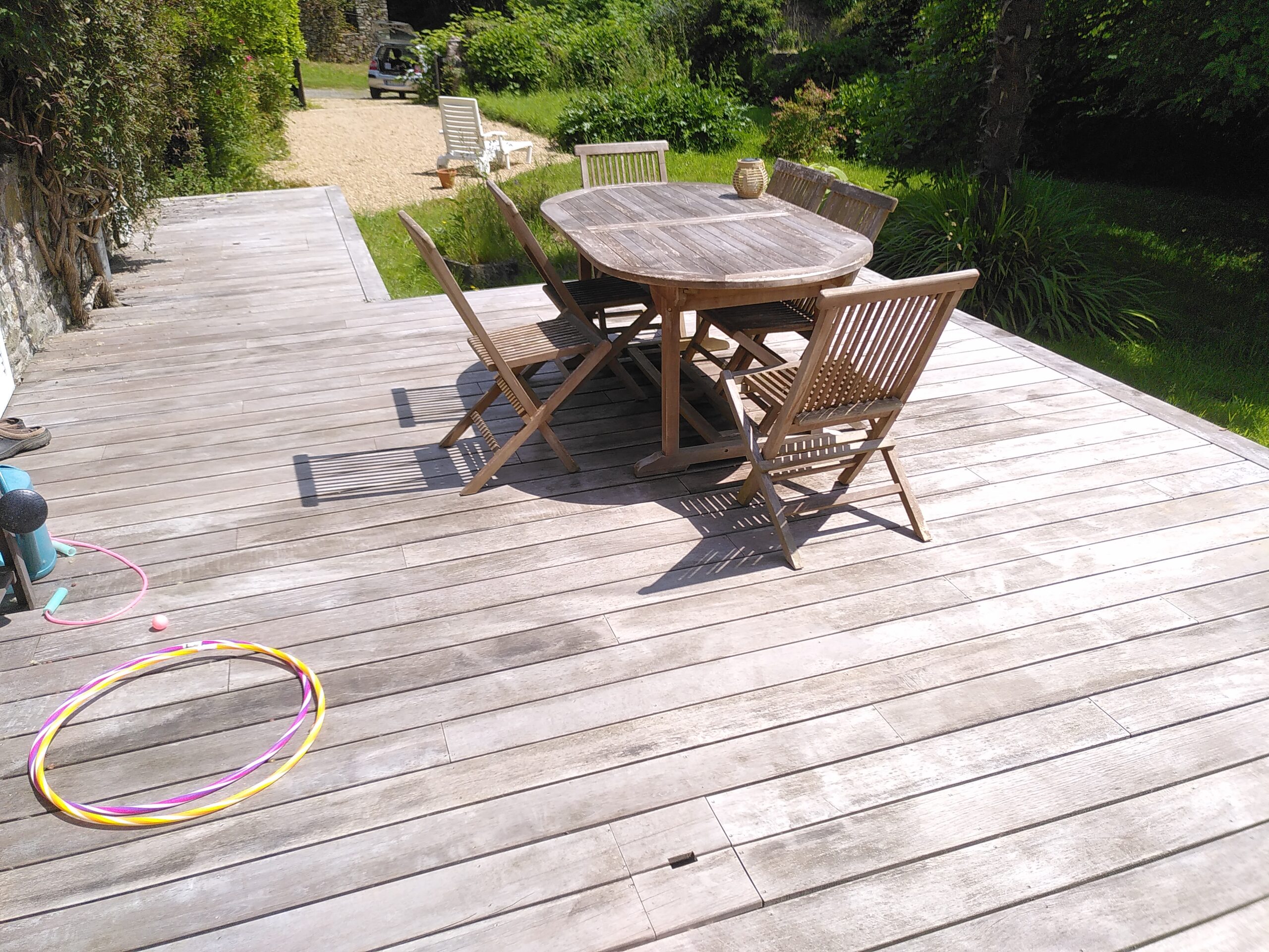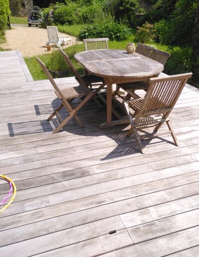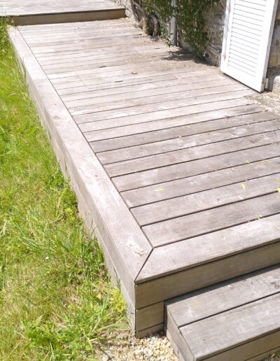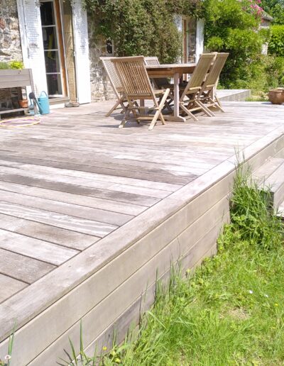 Terrasse fermée de 45 m², réalisée durant l’été 2023. Le platelage en niové est supporté par des lambourdes de la même essence. L’ensemble repose sur une structure en douglas sur plots béton. Diverses trappes ont été installées afin de pouvoir accéder sous la terrasse, et d’y ranger des outils le cas échéant.